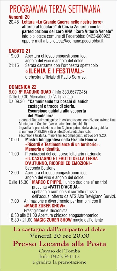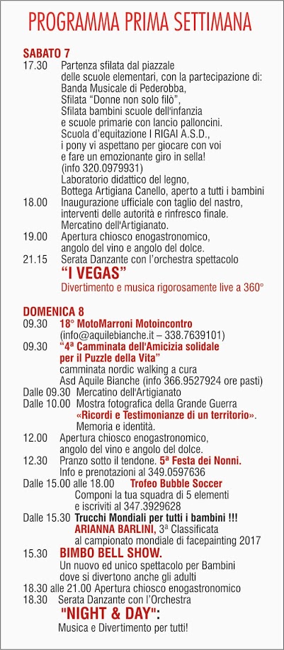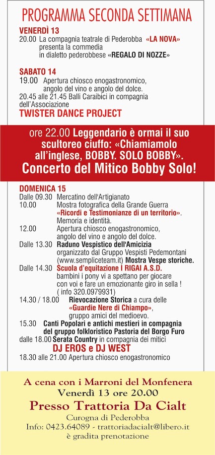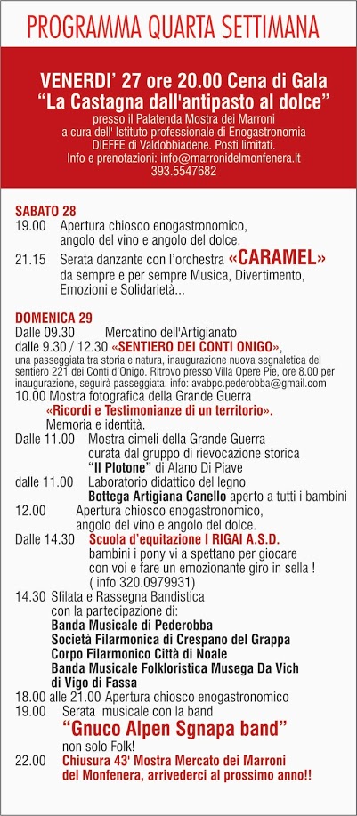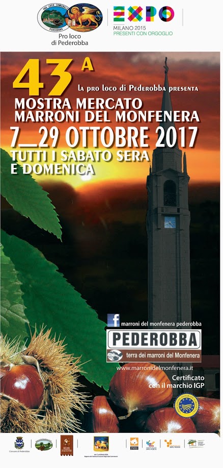 Ciao a tutti. Ecco il programma della prossima 43′ Mostra Mercato dei Marroni del Monfenera! Un trionfo di eventi ricco di iniziative da non perdere! Vi preghiamo di inoltrarlo a tutti i vostri amici ed invitateli a mettere “Mi Piace“ sulla nostra pagina così potrete essere aggiornati in tempo reale sulle splendide iniziative di questa nuova rassegna. Da non perdere il concerto Bobby Solo del 14 ottobre. Che aspettate? Passate parola!